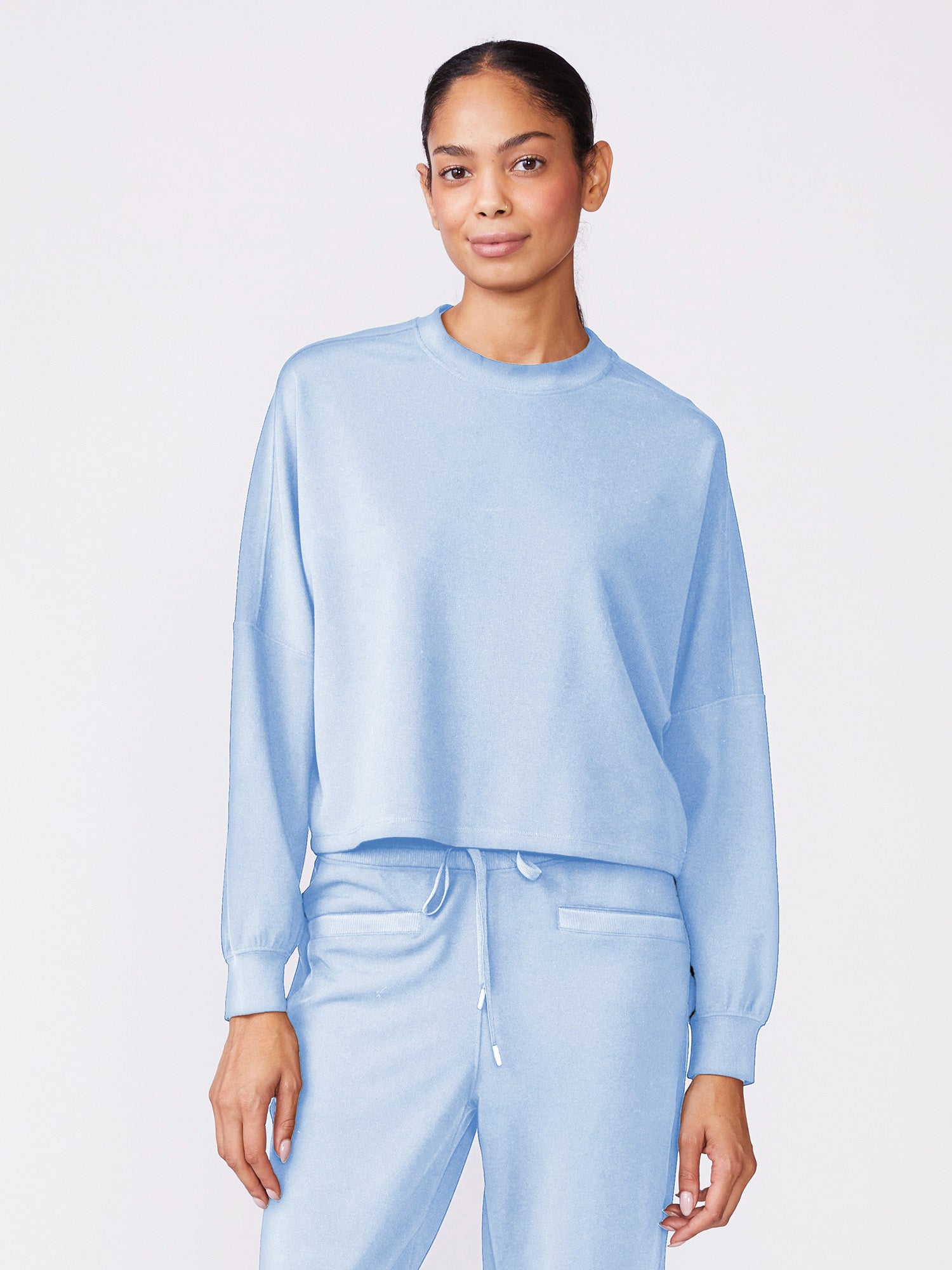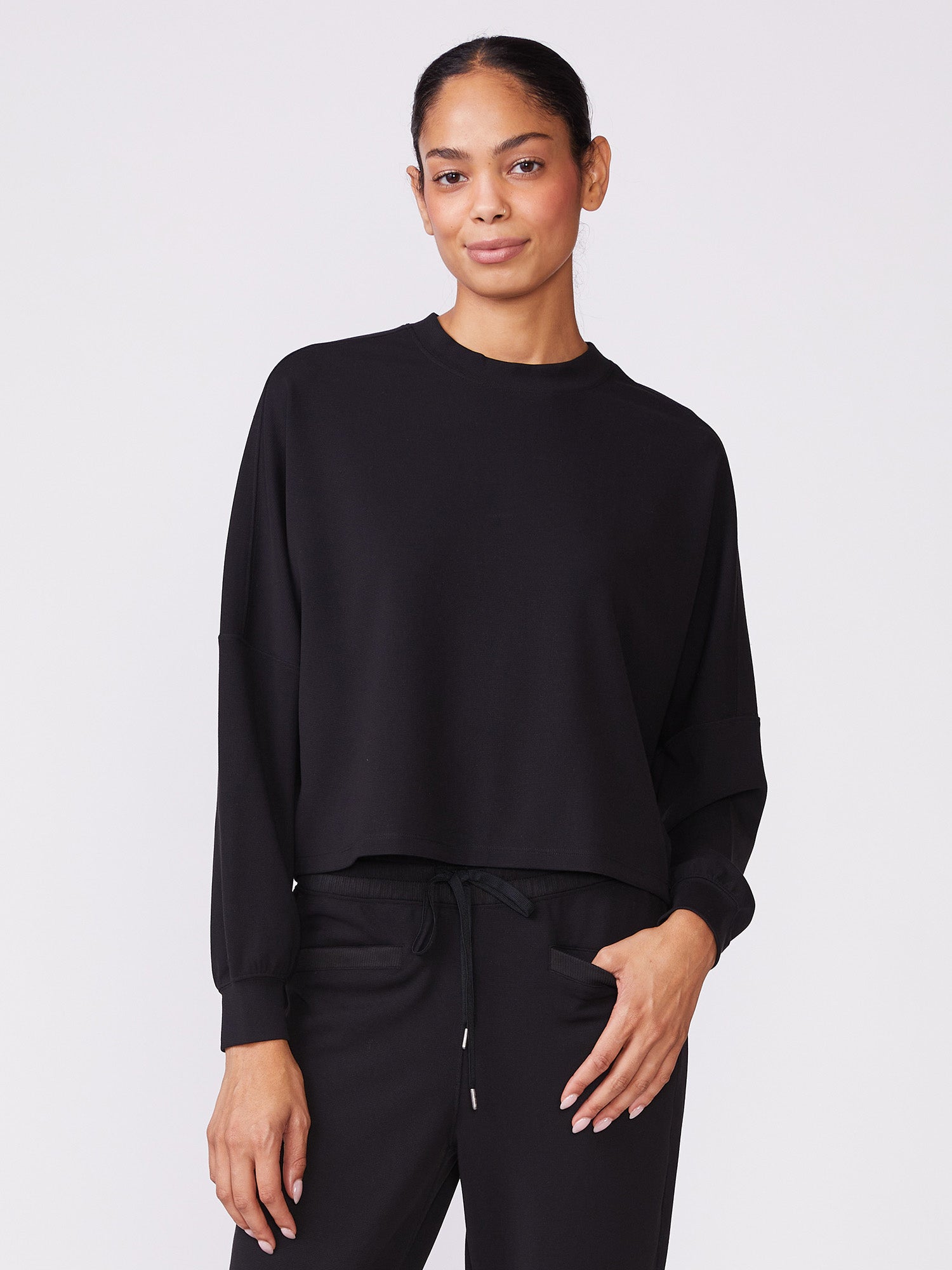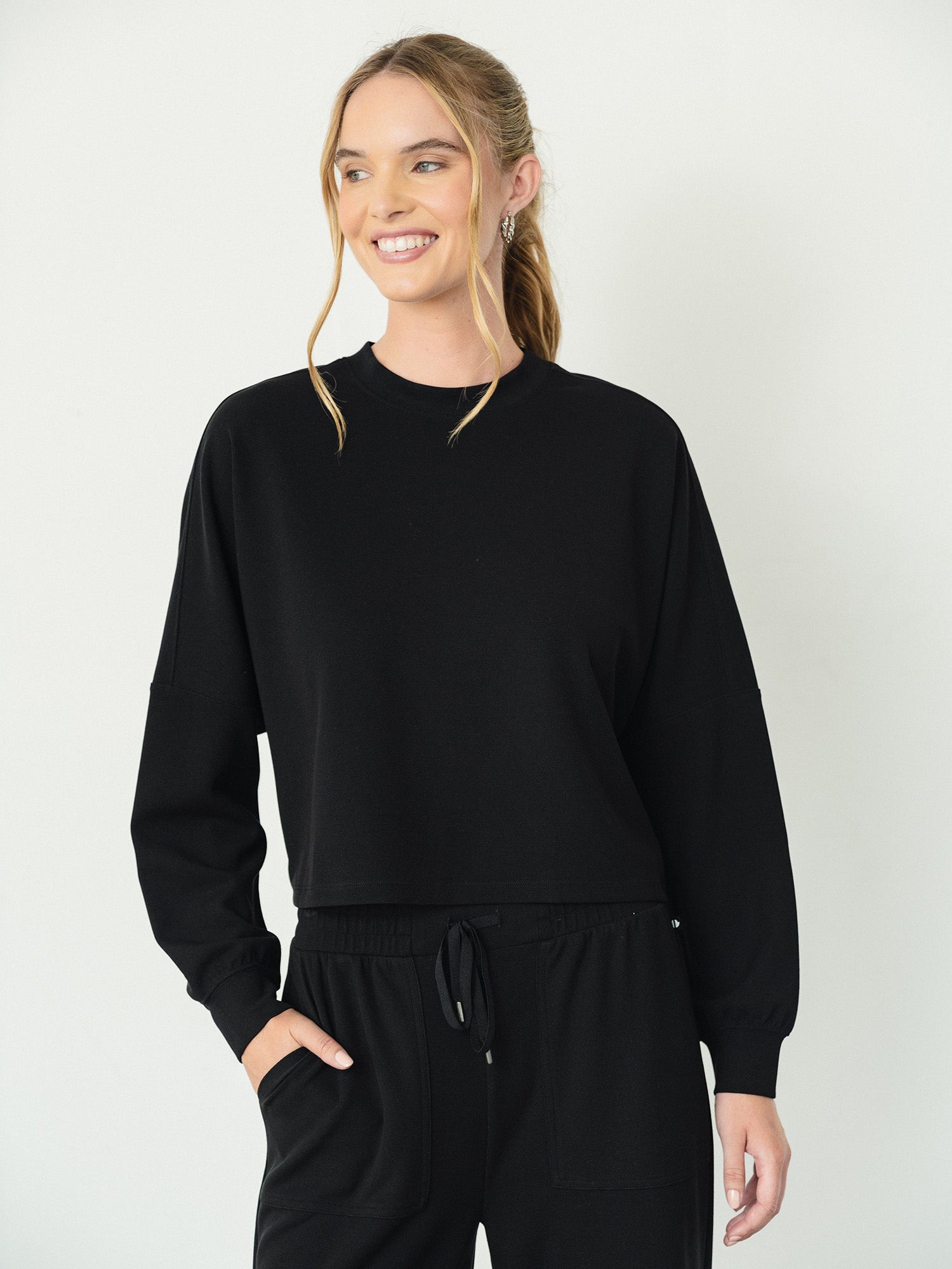 This Long Sleeve Dolman Knit Top features a relaxed fit and crew neckline. Pairs effortlessly with the matching Luxe Waffle Mix Taper Pant for a comfy and cozy looking for indoors and out.