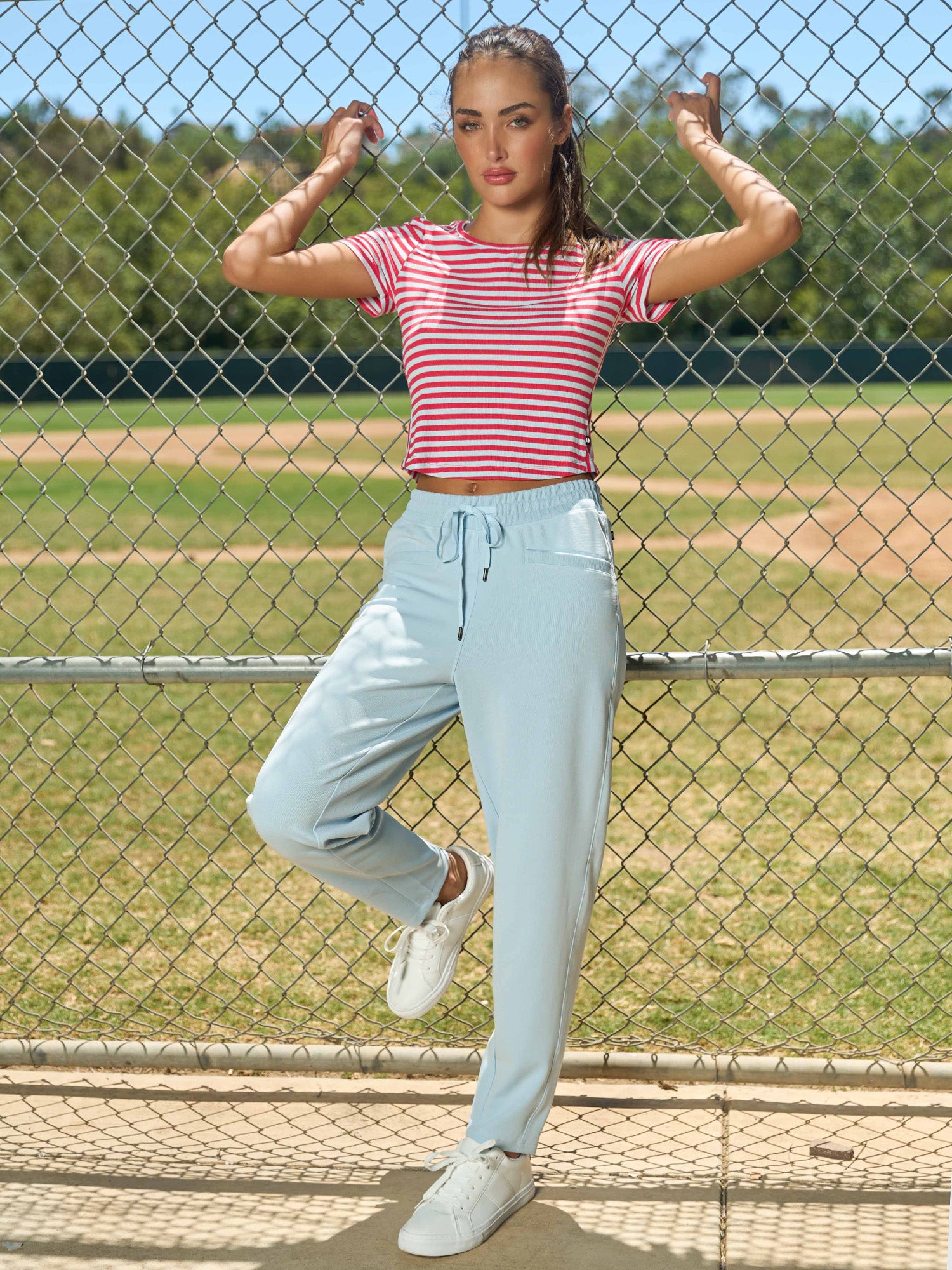 The Luxe Waffle Mix Taper Pant features an elastic waist with drawstring and two front pockets. This pant pairs effortlessly with our Long Sleeve Dolman Knit Top for the perfect cozy fit indoors and out.