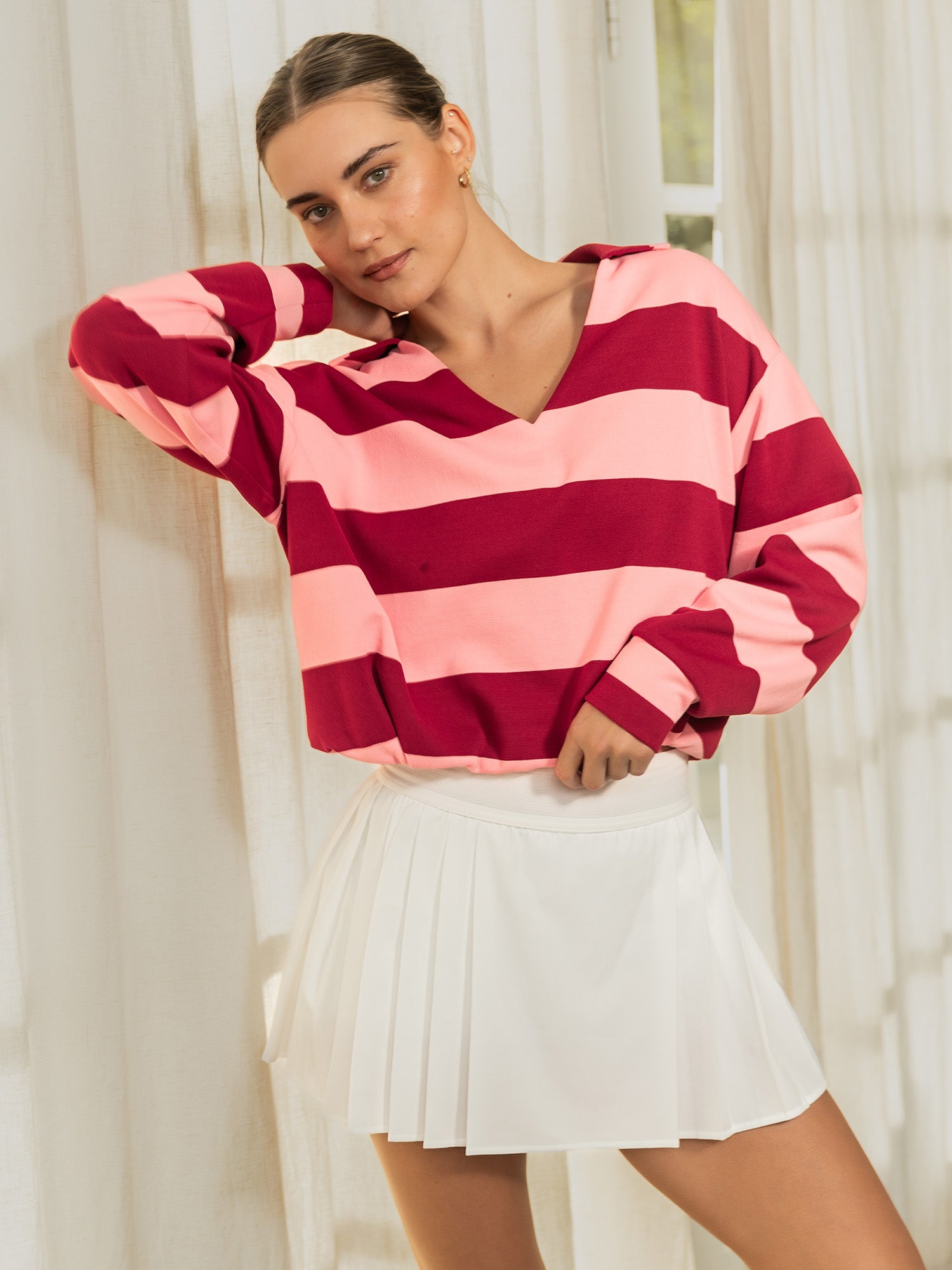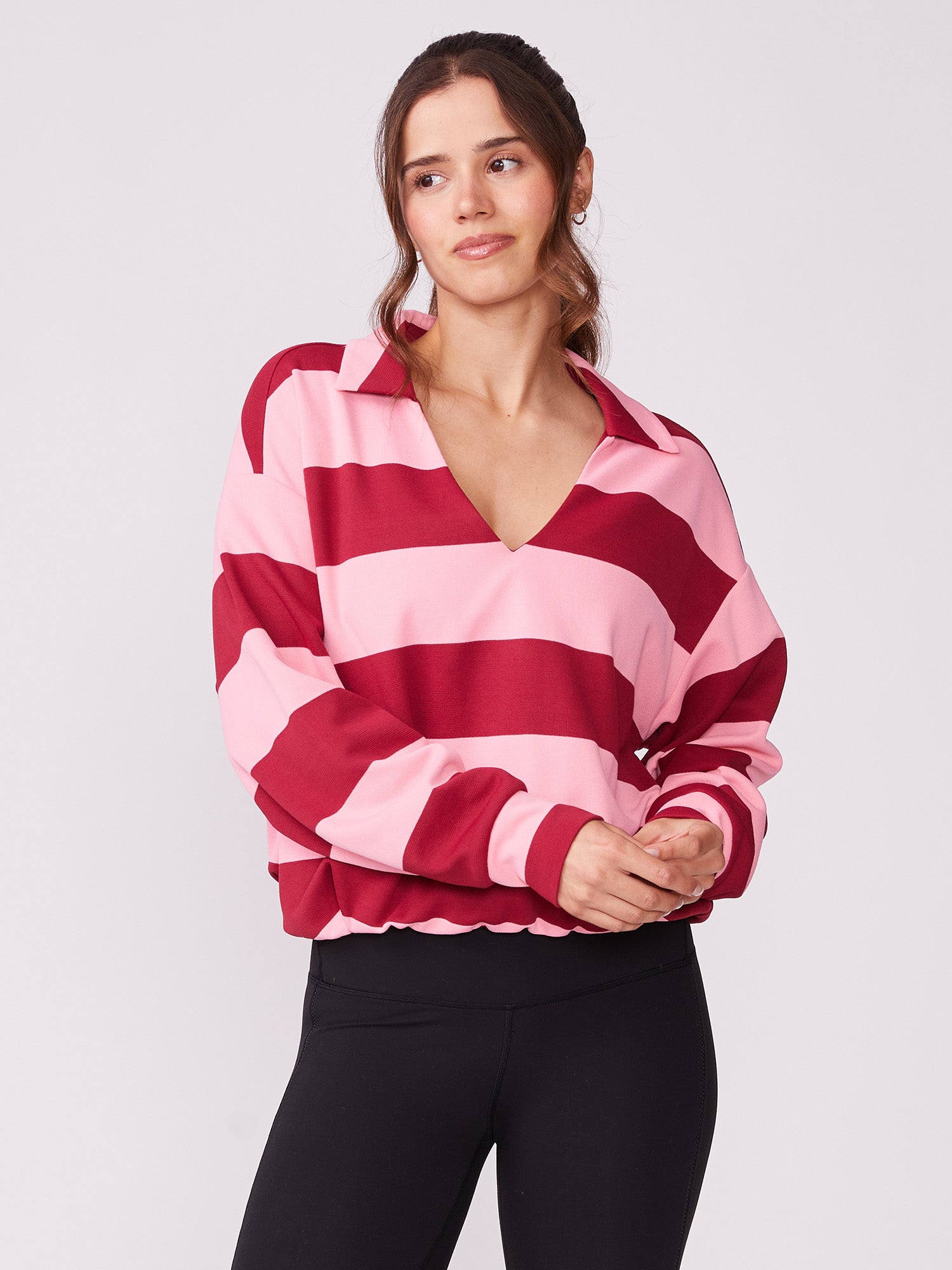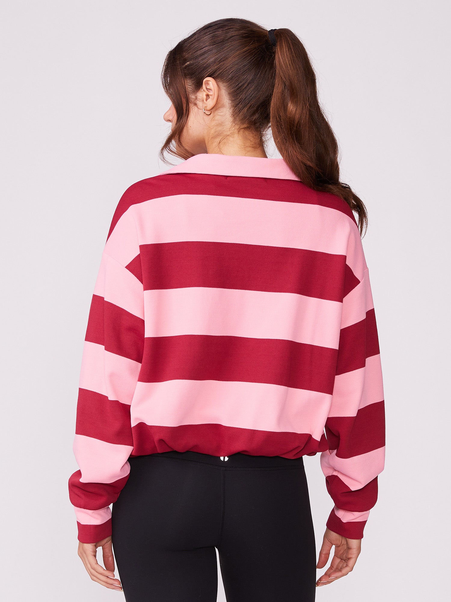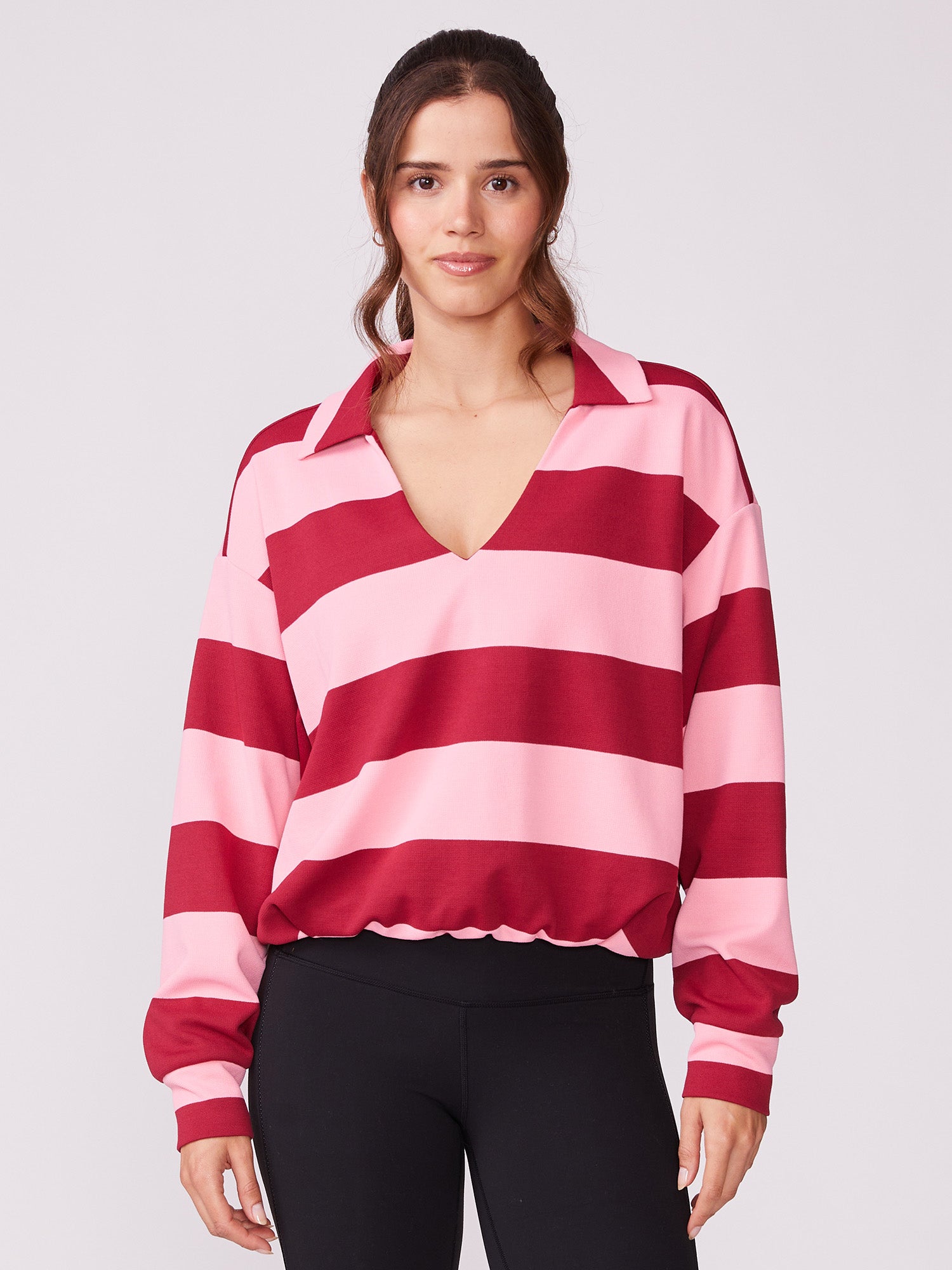 Elevate your athletic wardrobe with the Johnny Collar Bubble Pullover, a versatile essential that combines comfort with style. The open neckline provides breathable ease while the elasticized hem creates a flattering silhouette that moves with you. Seamlessly transition from court to casual by layering it with our leggings or tennis skorts, making this striped pullover the go-to piece for active days and beyond.
