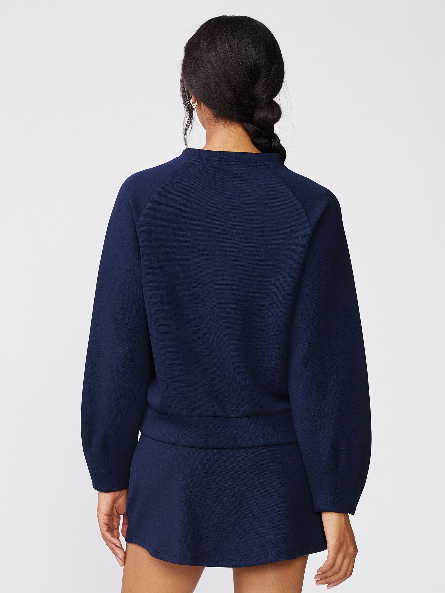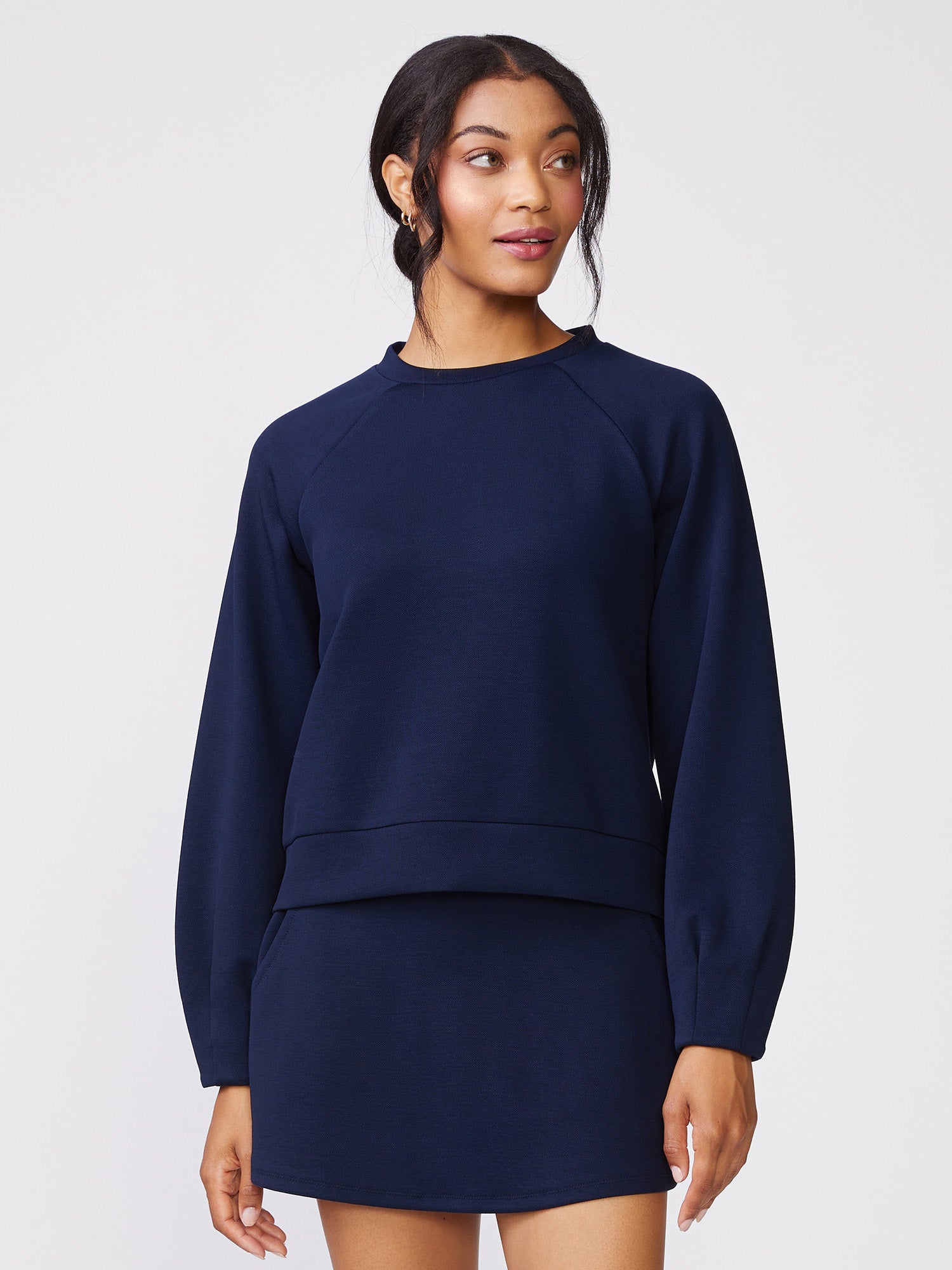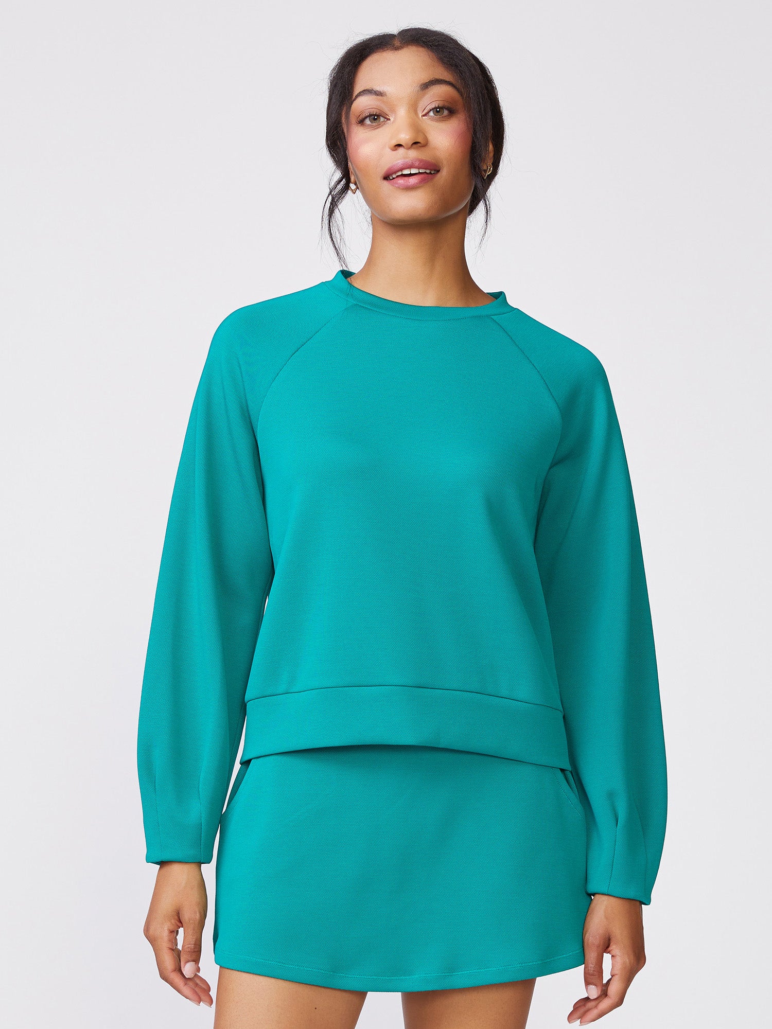 Our Pleat Sleeve Raglan Pullover is a classic crew neck elevated with pleat detailing at the sleeves. Made in our Jacquard Luxe for everyday comfort, it features a clean silhouette that's easy to wear and effortlessly stylish on its own, or pair it with the matching Pull On Scuba Skort or Tall Cuff Pull On Jogger for an easy, coordinated outfit perfect for lounging, travel, or days on the go.