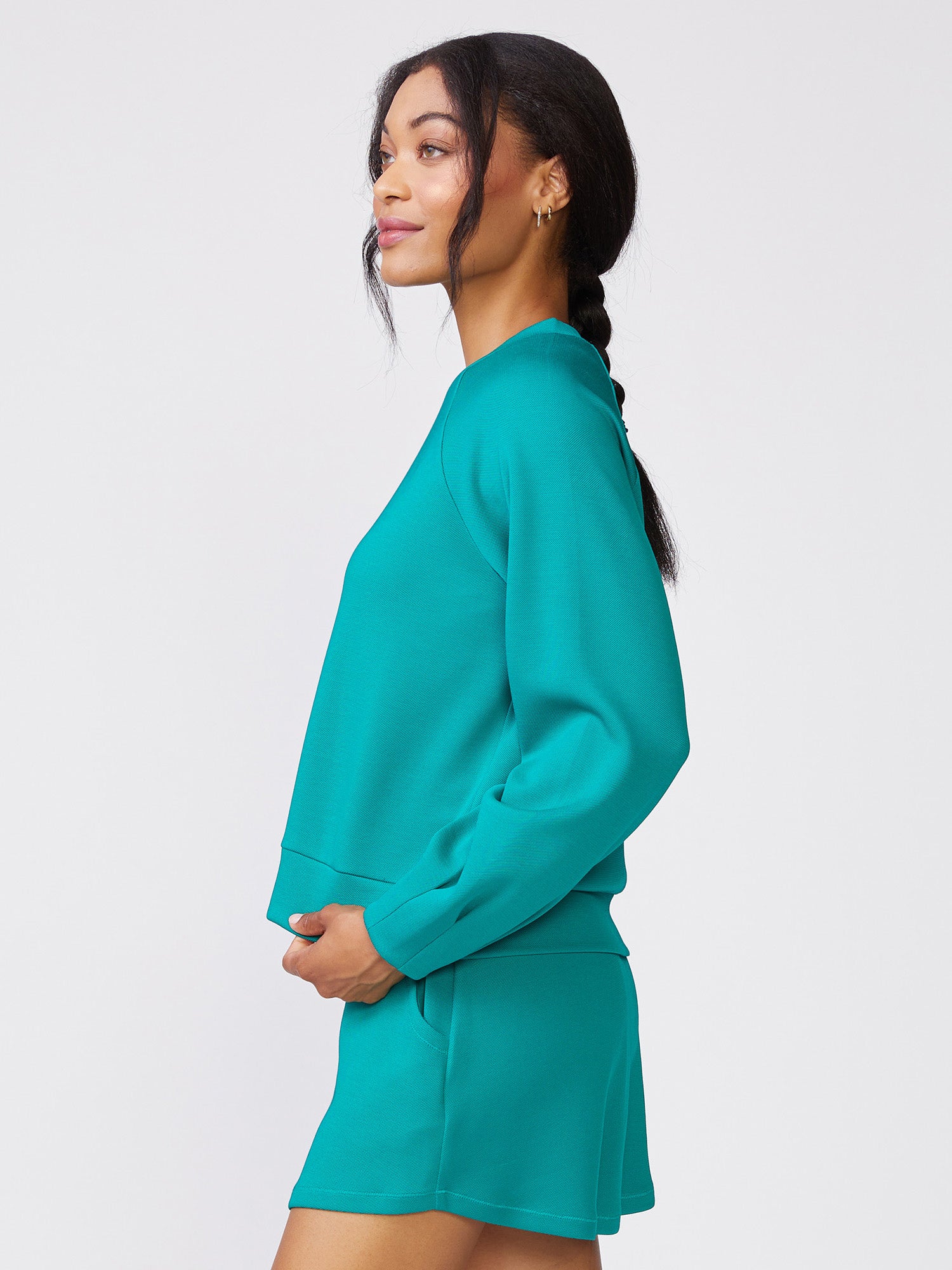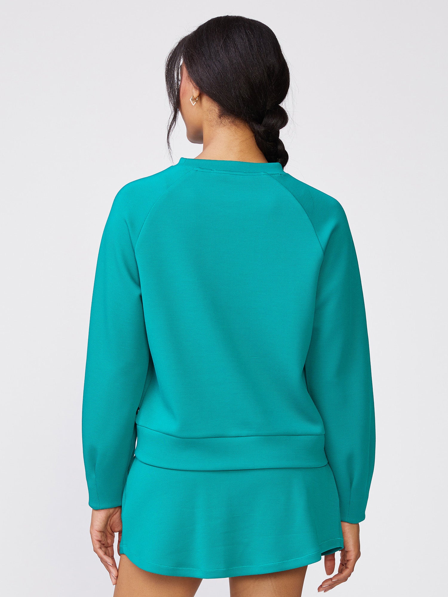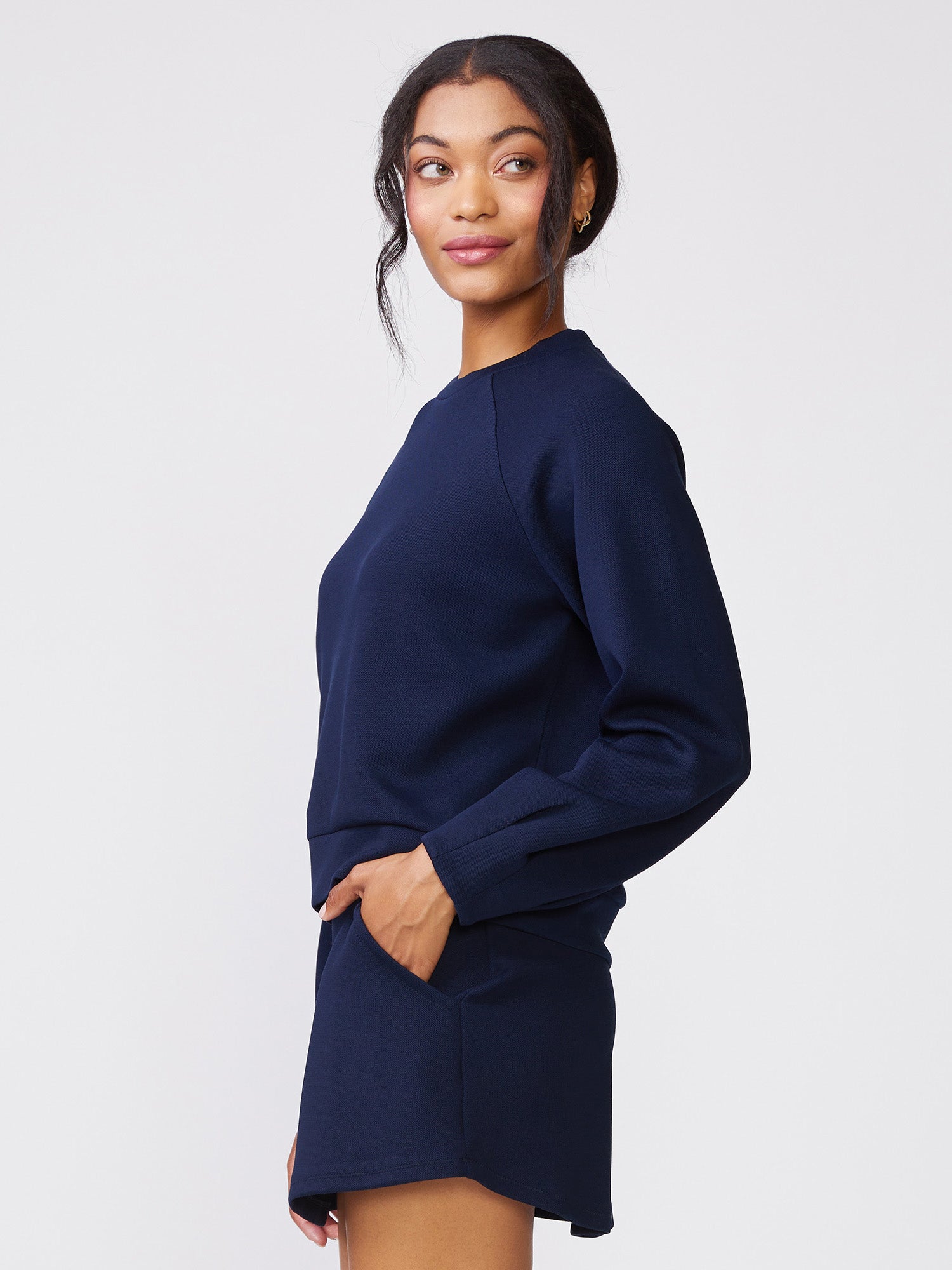 Our Pleat Sleeve Raglan Pullover is a classic crew neck elevated with pleat detailing at the sleeves. Made in our Jacquard Luxe for everyday comfort, it features a clean silhouette that's easy to wear and effortlessly stylish on its own, or pair it with the matching Pull On Scuba Skort or Tall Cuff Pull On Jogger for an easy, coordinated outfit perfect for lounging, travel, or days on the go.