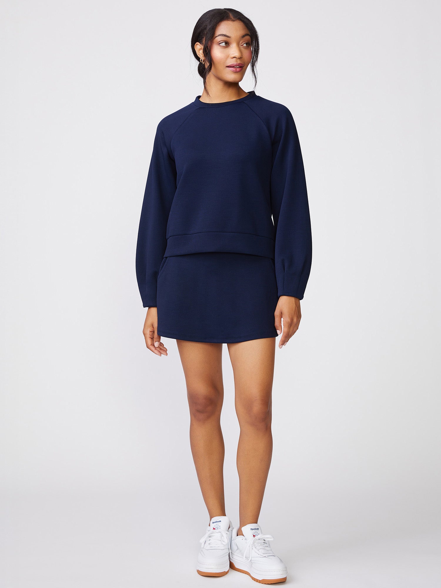 A modern take on a classic skort, designed for comfort and versatility. This skort features an elastic waistband with drawstring adjustability for a flexible and flattering fit, while side pockets and a built in undershort provide practical coverage and convenience. Made in our Jacquard Luxe fabric with a sand/garment wash and a super soft hand feel, this piece is ideal for anytime wear. Pairs perfectly with our Pleat Sleeve Raglan Pullover.