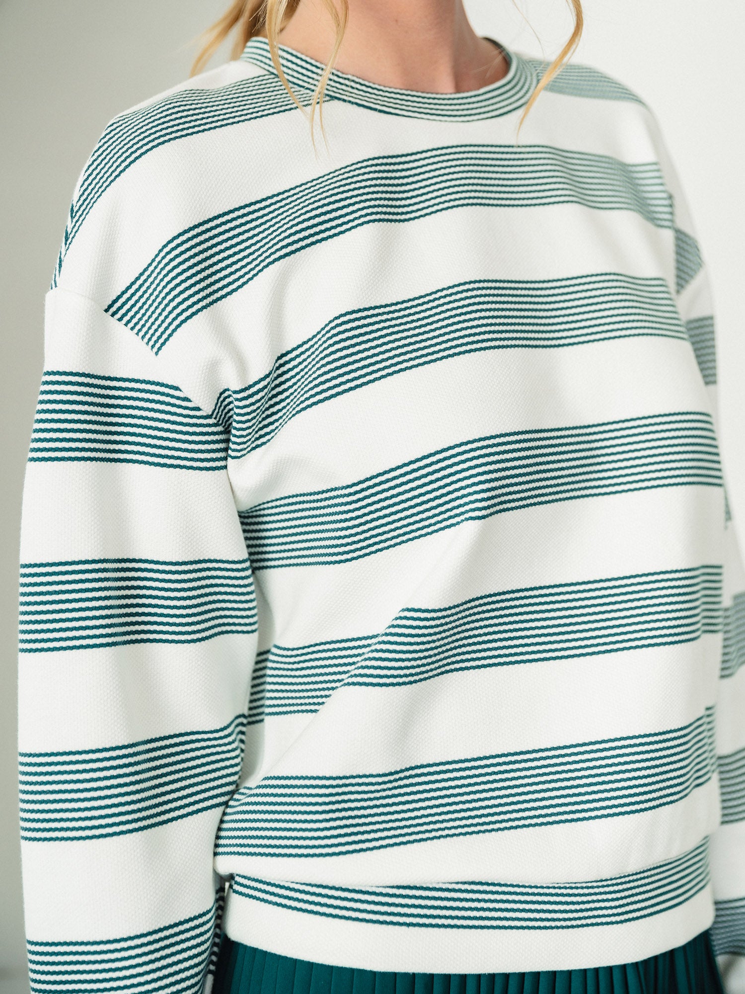 Our easy Stripe Crew Neck Pullover features a relaxed drop shoulder silhouette and is made in our new moisture wicking, anti-bacterial Pique Stripe Knit. Designed for performance and style, pair this piece with any of our pleated skorts for a fresh, sporty look on and off the courts.