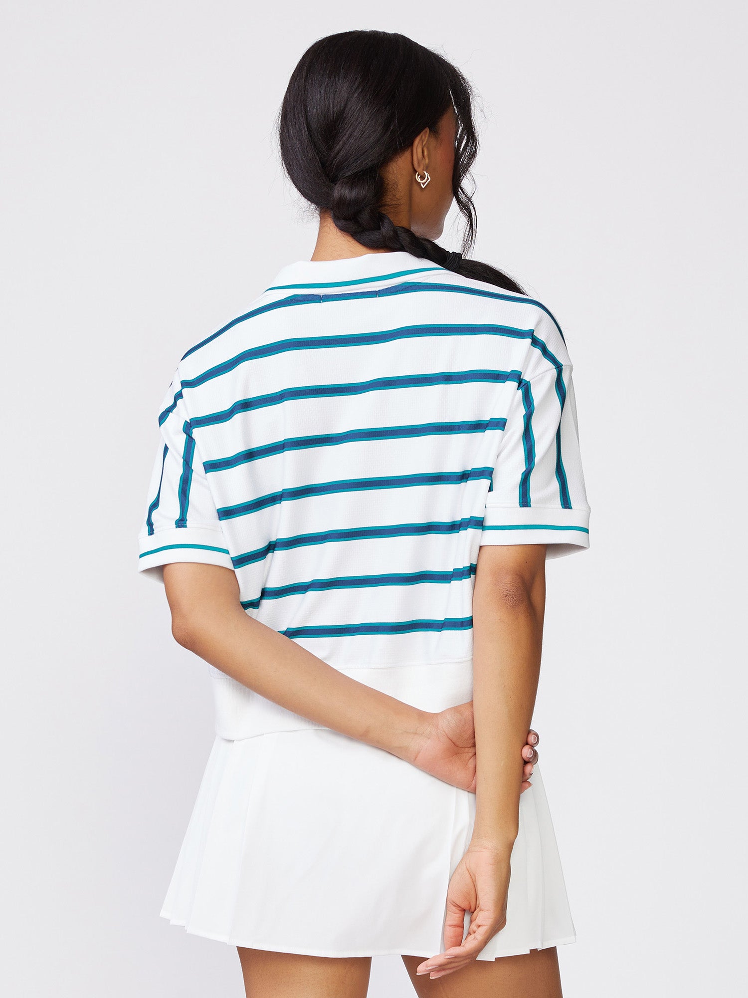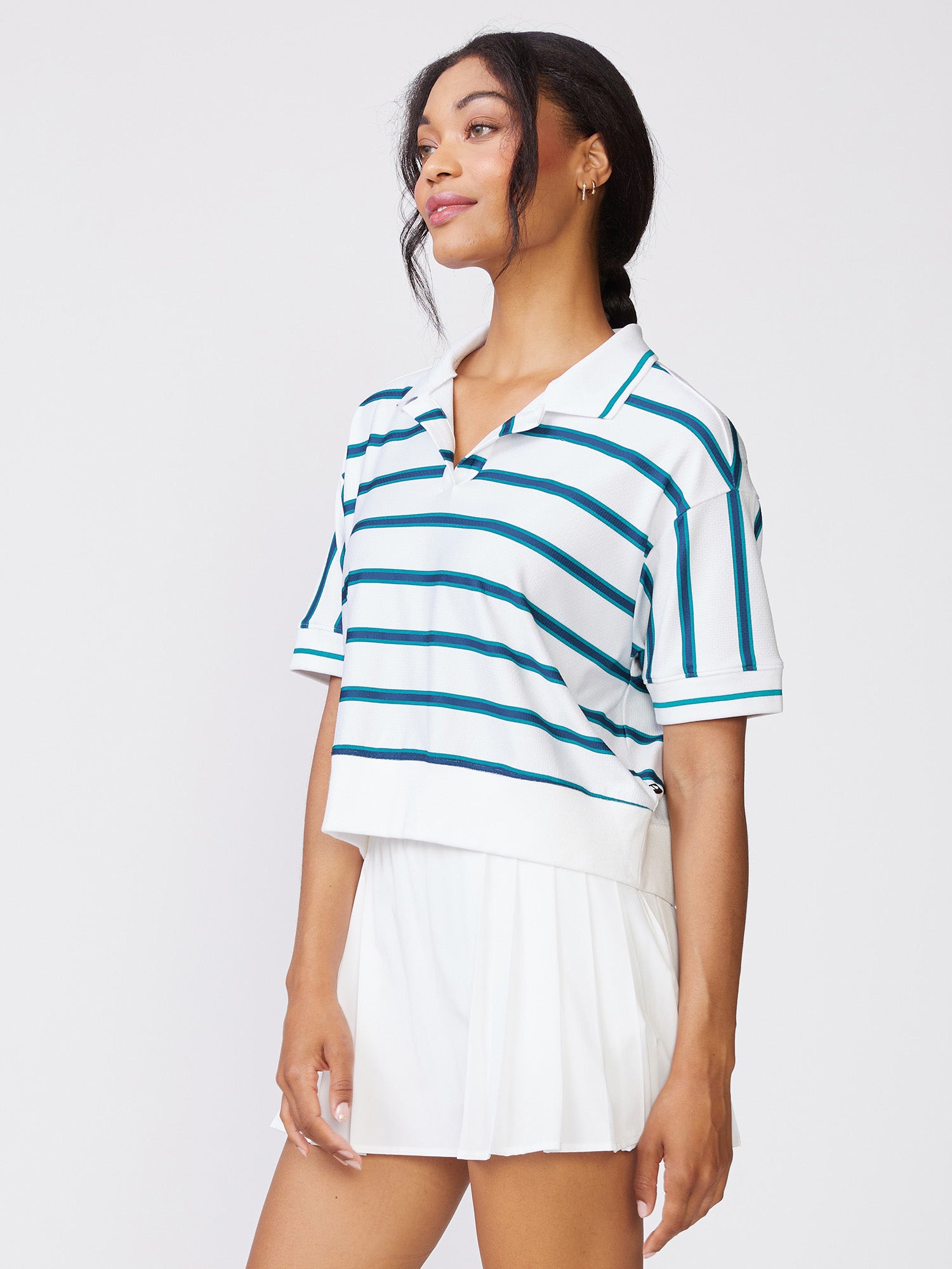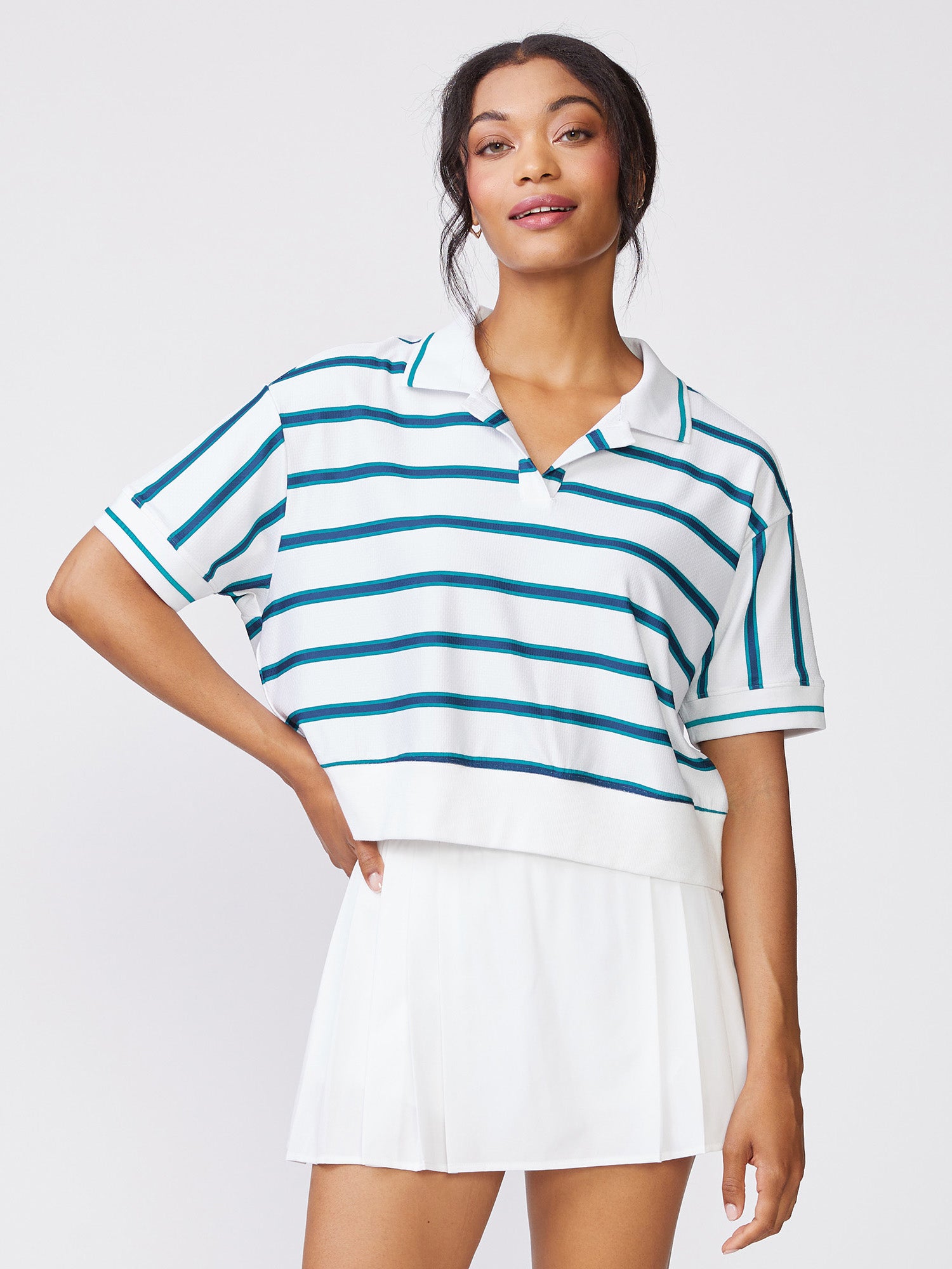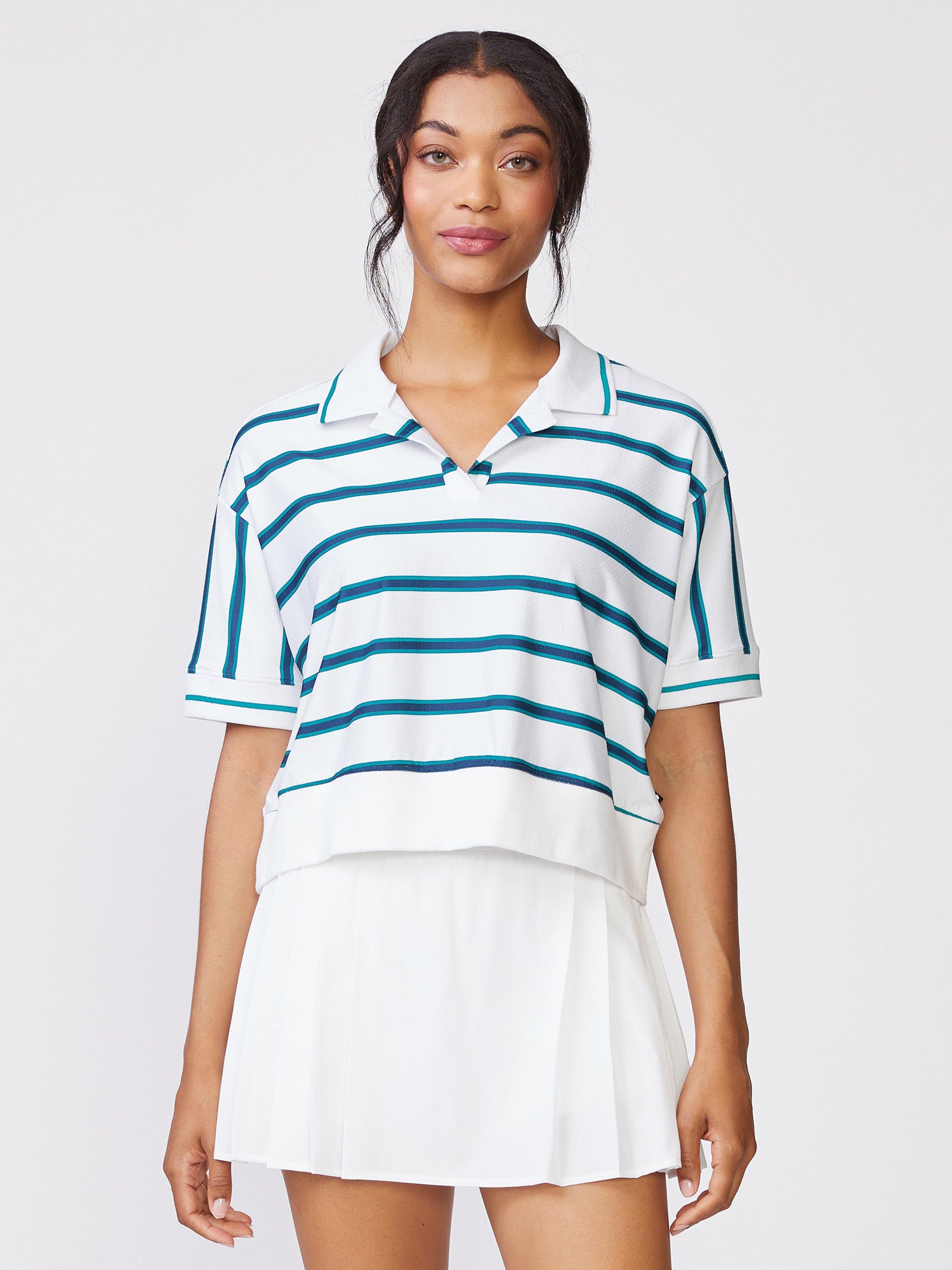 Sporty and versatile, this short sleeve Stripe Polo Sweatshirt Top is the perfect layer for days on or off the court. Designed with a relaxed yet polished feel, it delivers effortless comfort while maintaining a classic athletic look. Pair it with our courtside skorts for an easy, put-together outfit that moves seamlessly from match play to everyday wear.