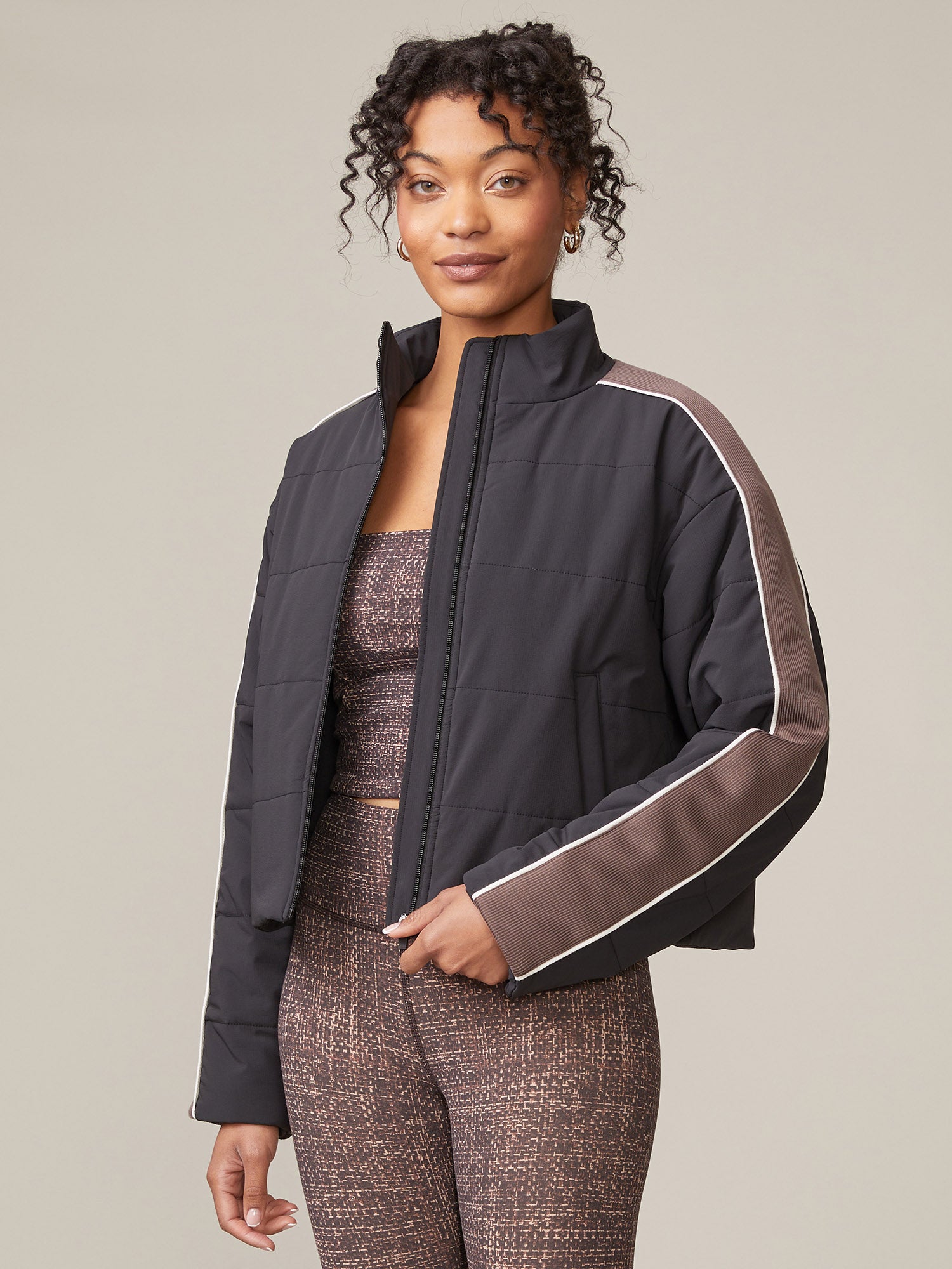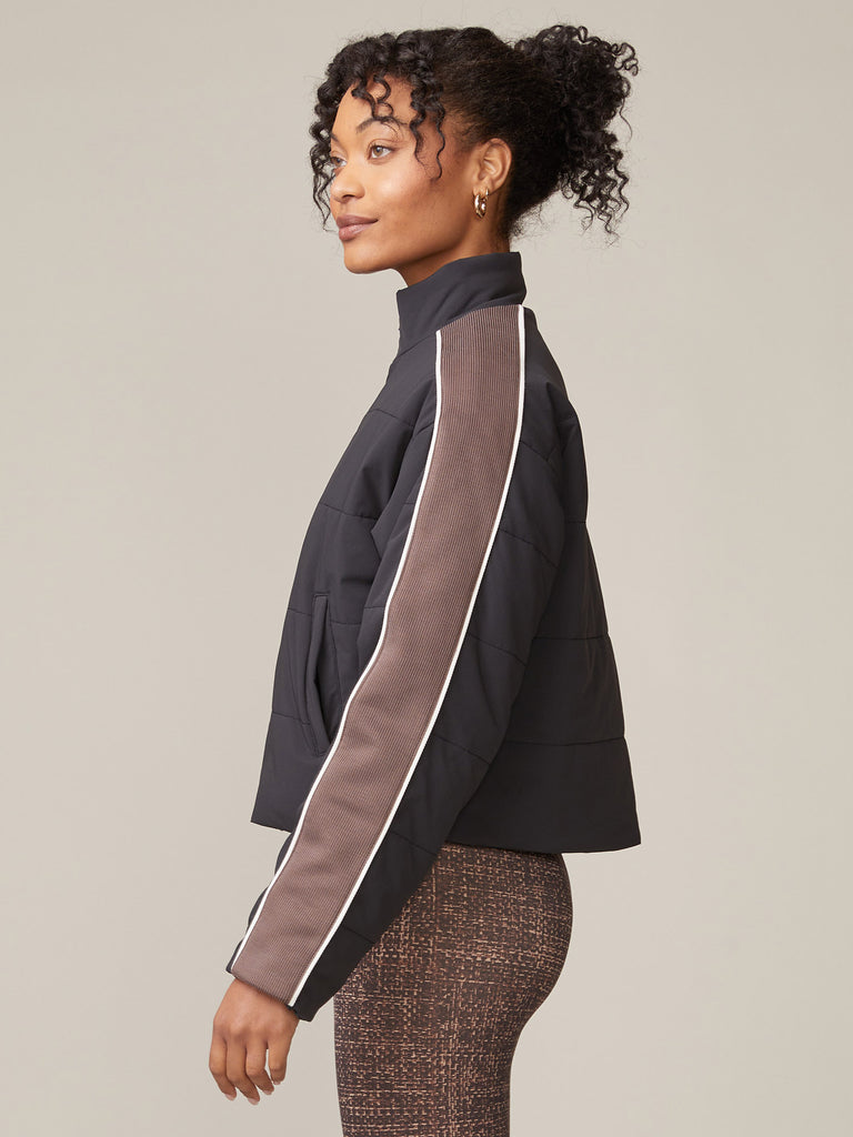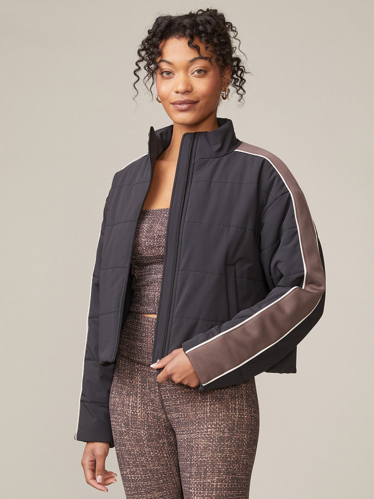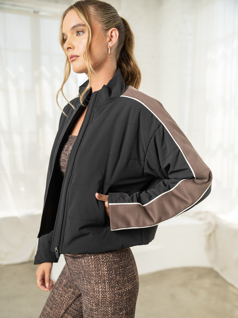 Stay warm in style with our sleek, new puffer jacket featuring a varsity stripe panel along the sleeves. Designed with light insulation for warmth without the bulk, this jacket is a perfect layering piece through the seasons. An interior bungee at the bottom hem allows for an adjustable fit. Keep cozy and on trend in our Varsity Sleeve Puffer Jacket!
