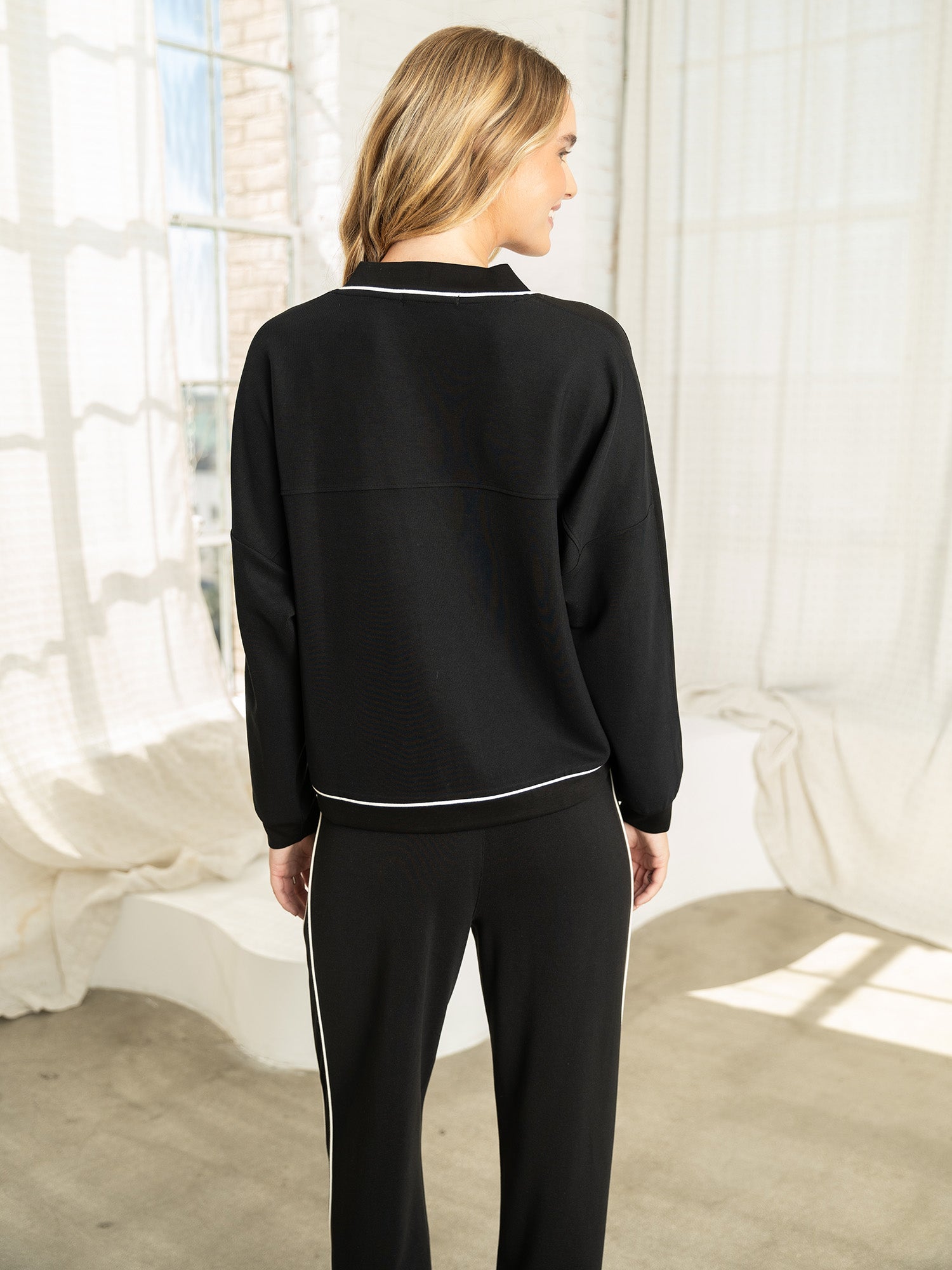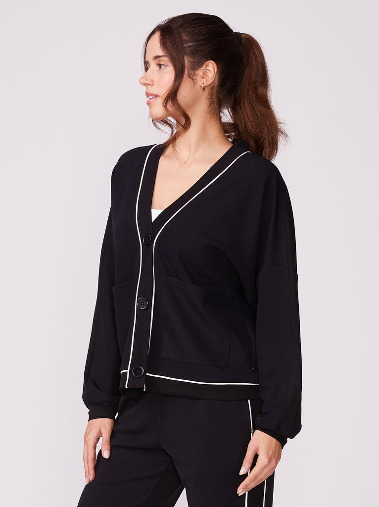 Our Luxe Waffle Mix Cardigan features a relaxed fit and contrast piping along three button front opening. Large patch pockets keep essentials handy. Made in our new Luxe Micro Waffle fabric, this piece is the matching top for our Luxe Waffle Mix Pant. The perfect set for lounging indoors or stepping out in style.