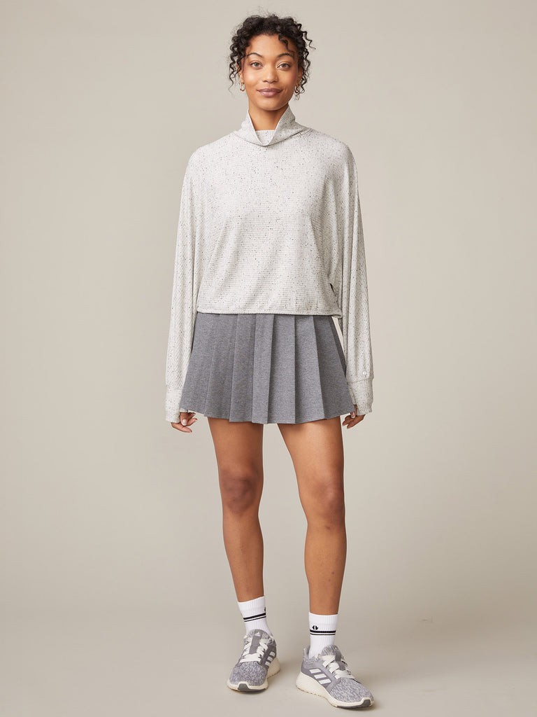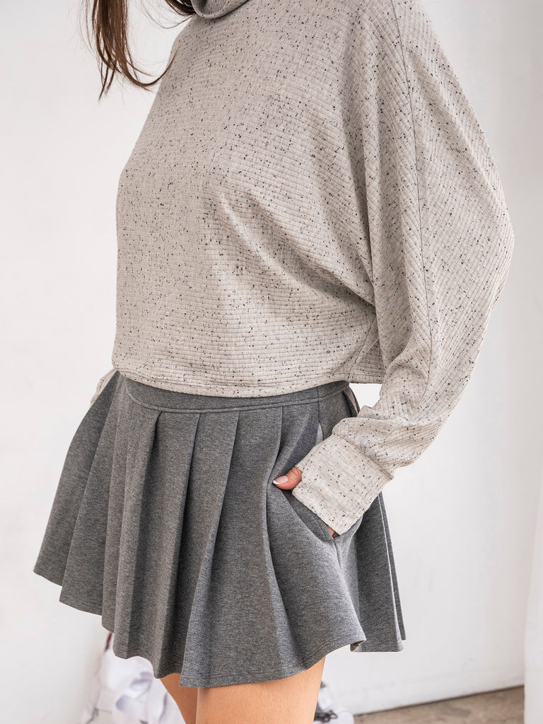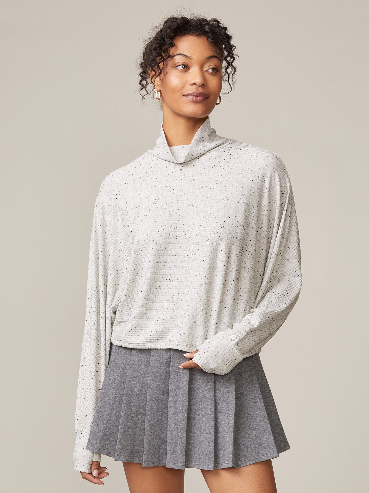 Our Speckle Rib Dolman Top is a long sleeve with a relaxed fit and features a mock neckline with thumbholes on the sleeves. This top pairs perfectly with our Heather Ponte Pleated Skort.
