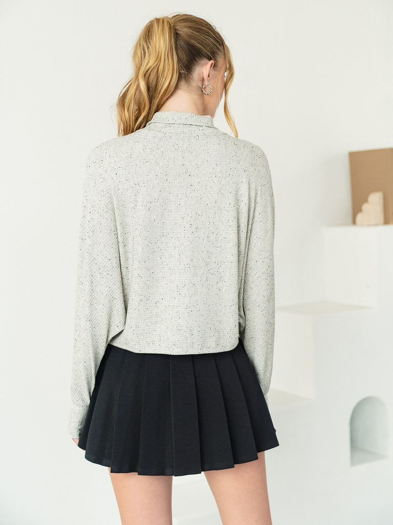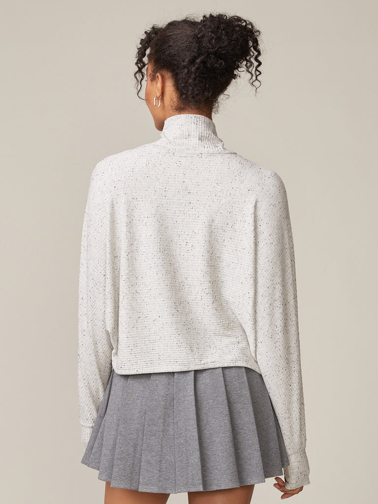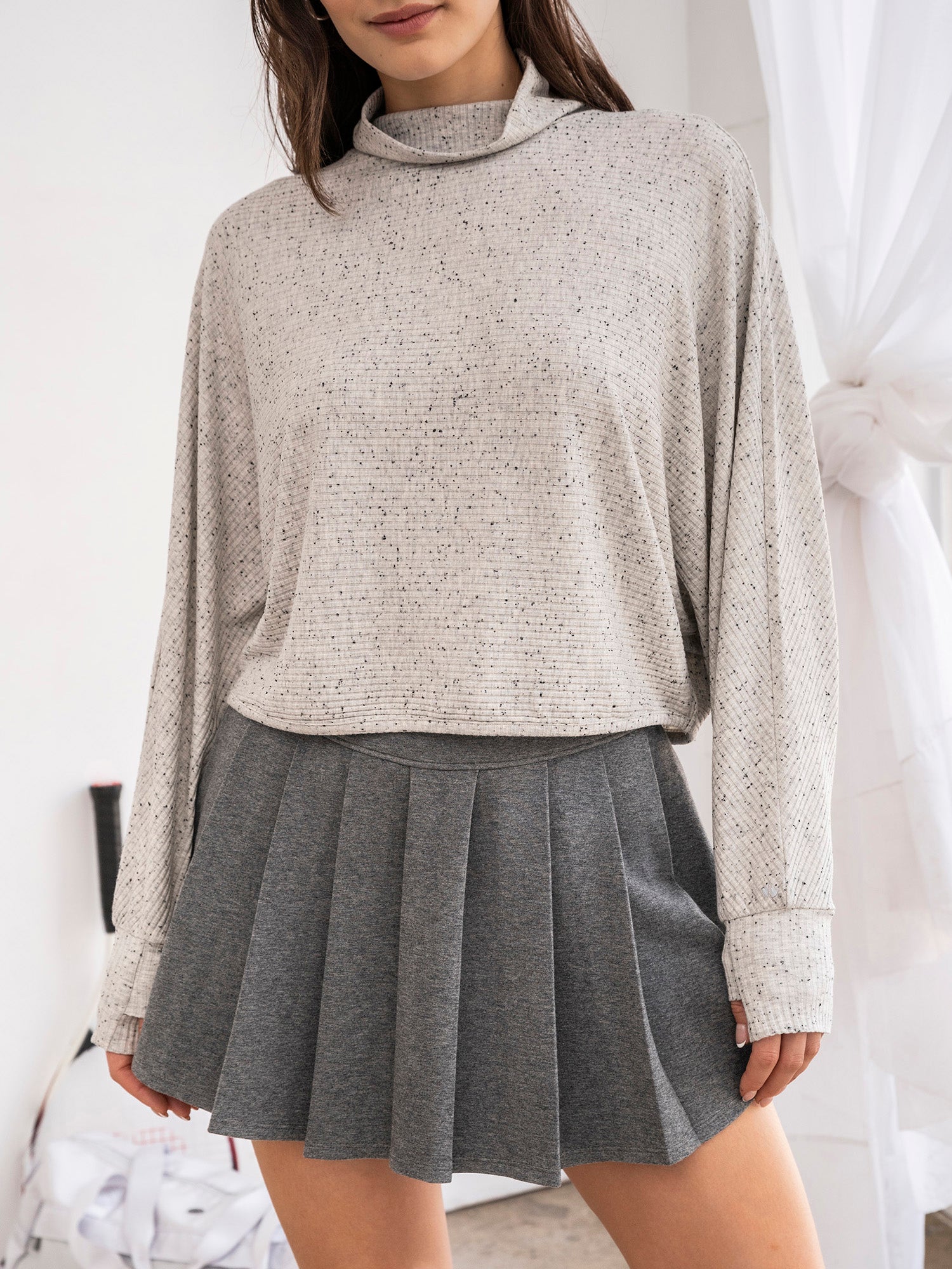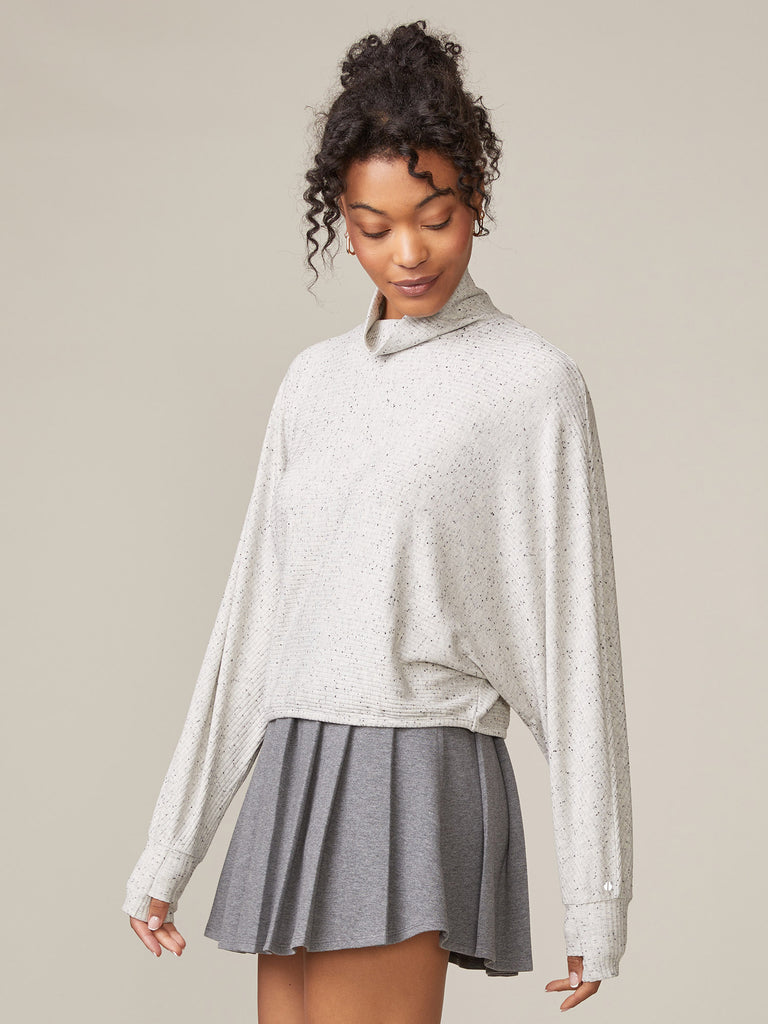 Our Speckle Rib Dolman Top is a long sleeve with a relaxed fit and features a mock neckline with thumbholes on the sleeves. This top pairs perfectly with our Heather Ponte Pleated Skort.