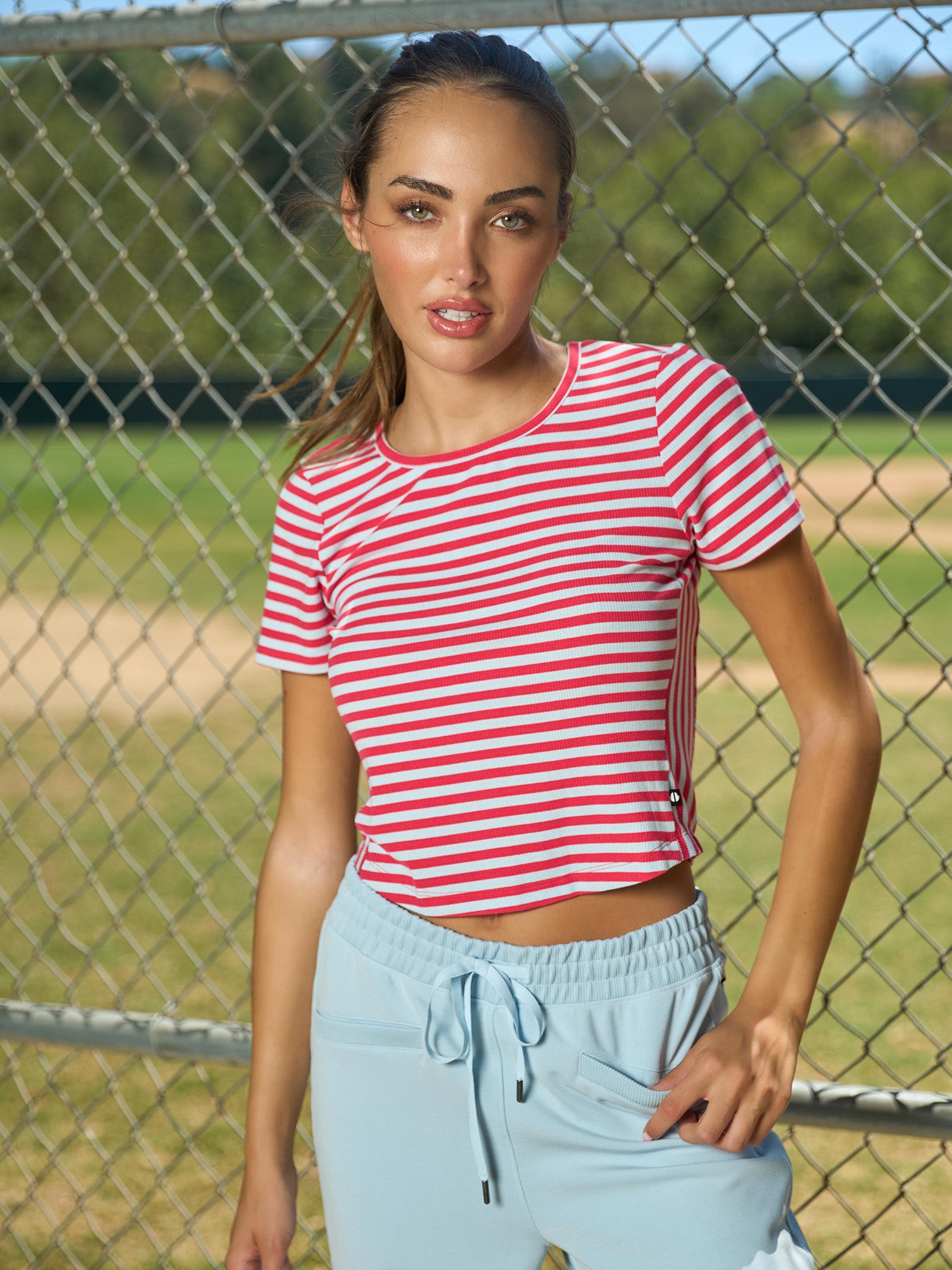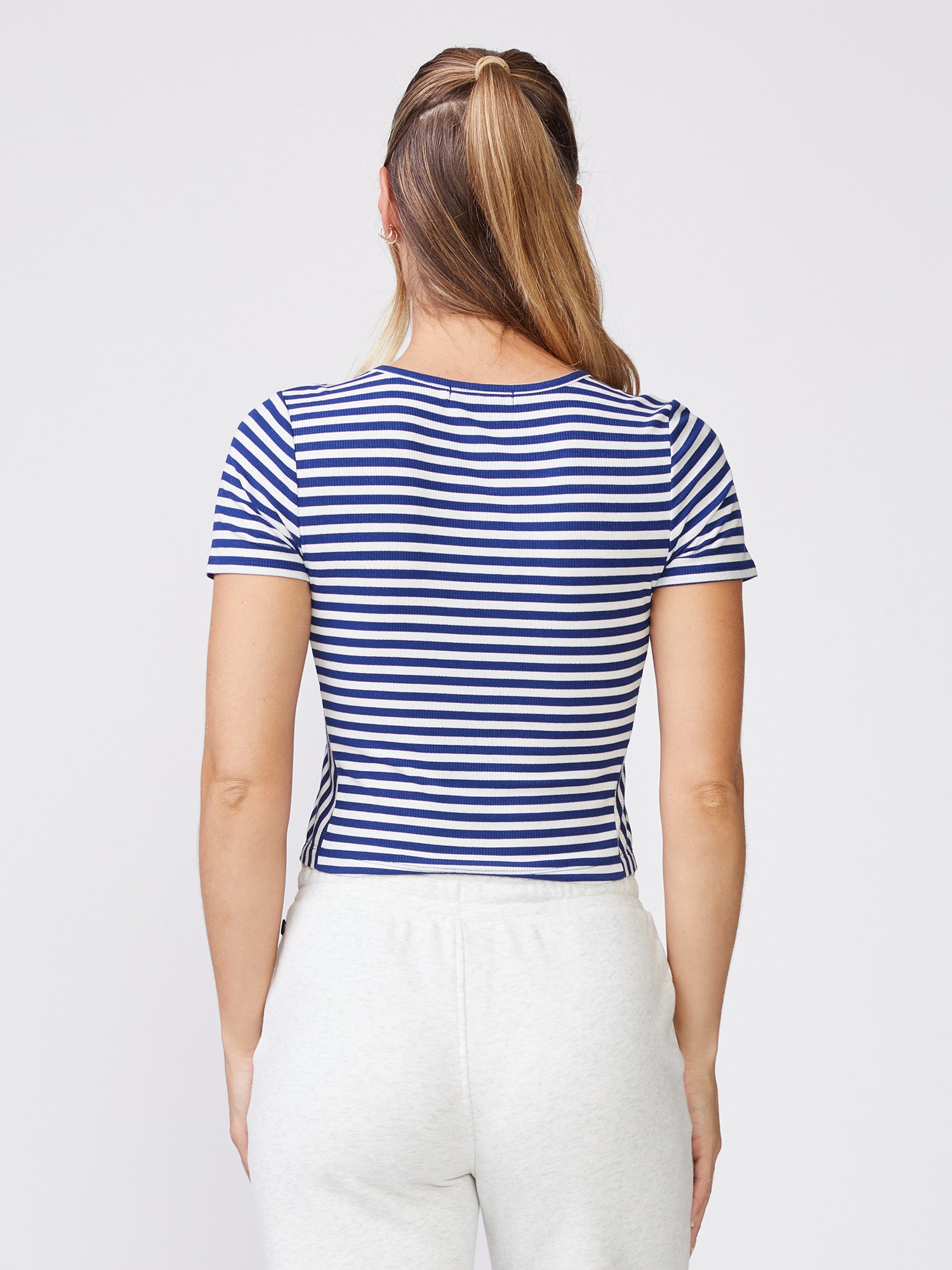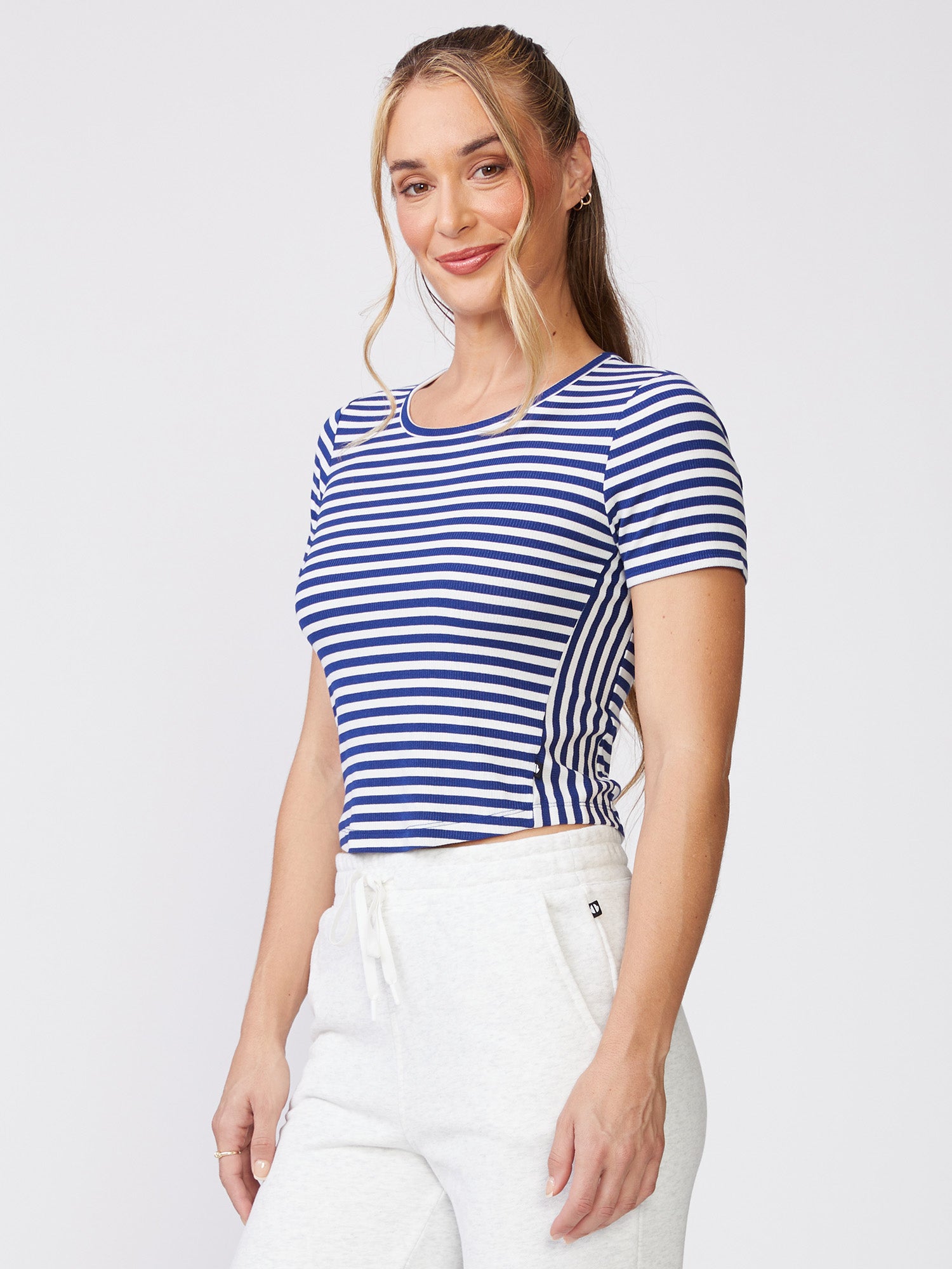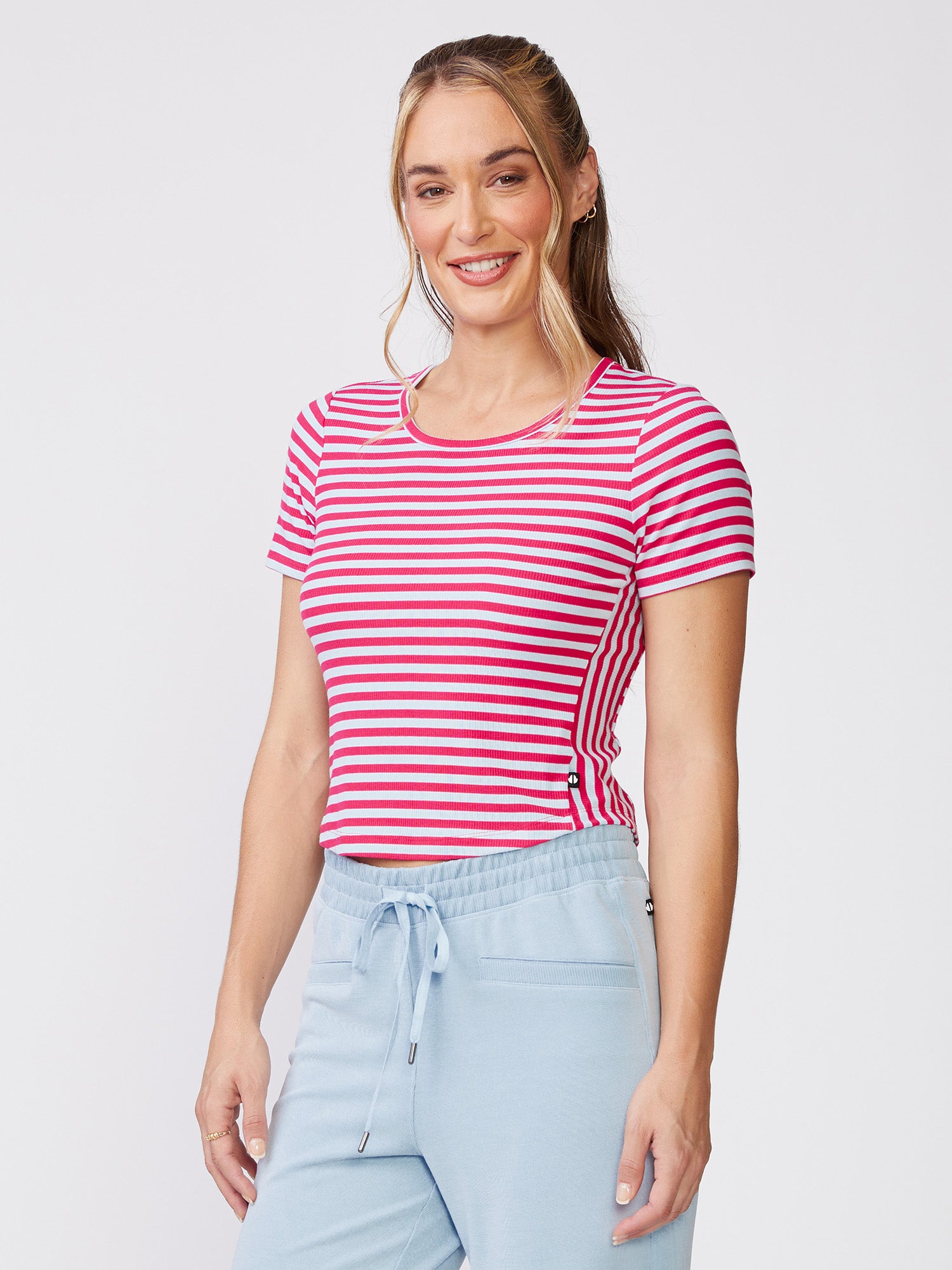 Our Stripe Crew Neck Tee is the perfect meet and greet length with directional stripes, side insets, and shirt tail hem. Made in our Striped Rib Jersey, wear this tee with our Tape Trim Wrap Front Skort for a cute courtside look or the Luxe Waffle Mix Taper Pant for a casual and comfy fit.